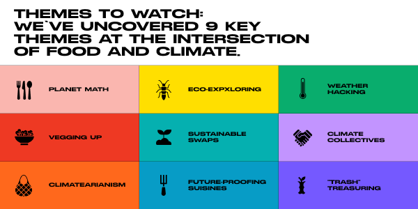 '음식과 온난화'는 이 중요한 시기에 대응하기 위해 얼마나 많은 사람들이 행동을 바꾸고 있는지 보여준다. 재배자부터 생산자, 소비자, 브랜드에 이르기까지 사람들은 창의성, 혁신, 즐거움, 호기심으로 이 순간을 맞이하고 있다. 이 보고서에서는 전 세계적으로 유행하고 있는 9가지 주요 주제를 살펴본다: