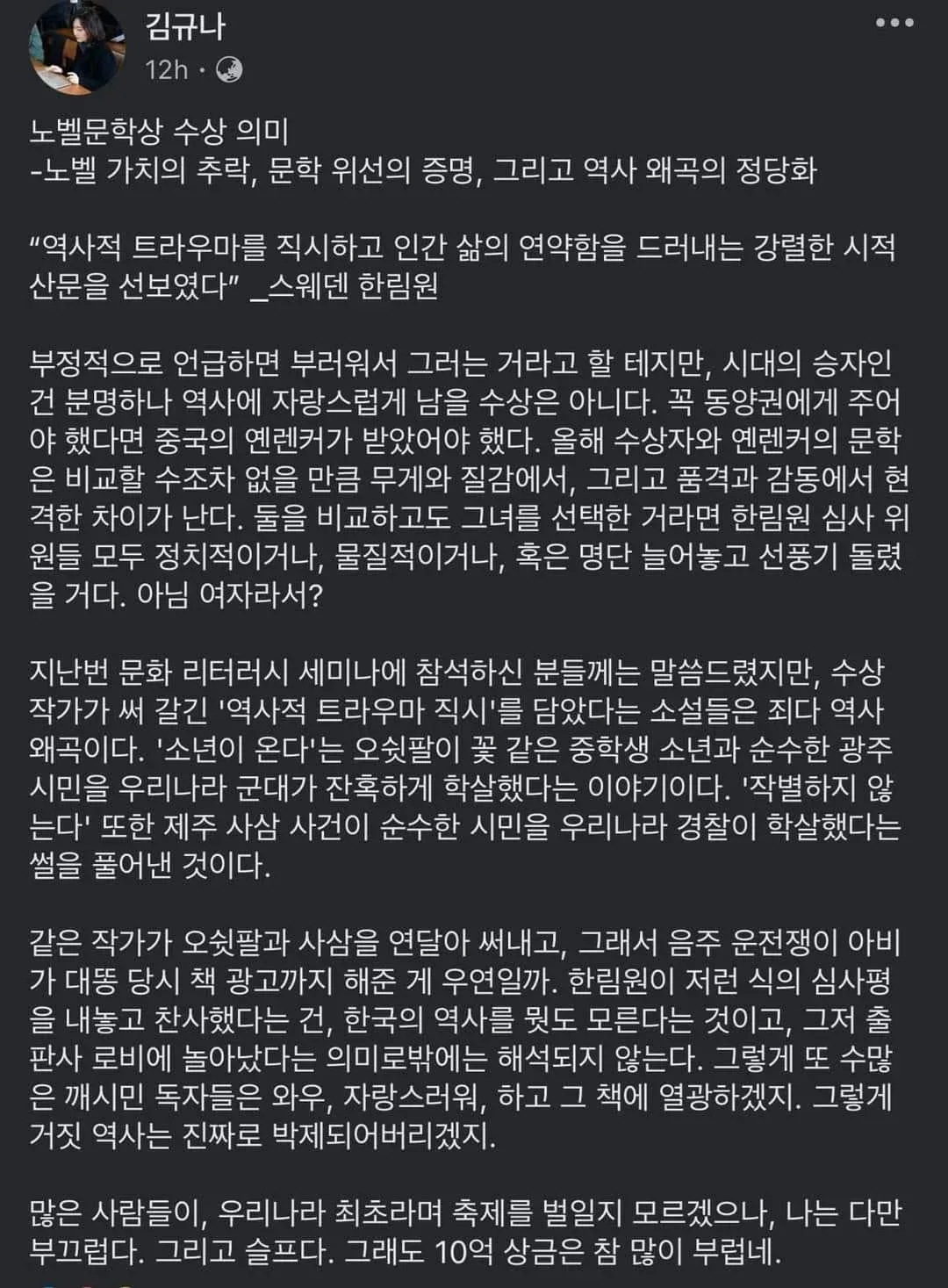 김규나 작가의 글에서 특히 문제가 되는 부분은 한강 작가의 수상이 “여자라서” 가능했다고 암시하는 대목이다. 이는 성별에 기반한 차별적인 발언으로, 한강 작가의 문학적 성취를 폄하하는 명백한 비하이다. 문학적 성취는 성별과 무관하게 평가받아야 하며, 노벨 문학상은 그 성과를 인정받은 사람에게 수여된다. 한강 작가의 작품은 여성성에 기반한 것이 아니라, 인간의 보편적 고통과 회복력에 대한 깊이 있는 통찰을 담고 있다.