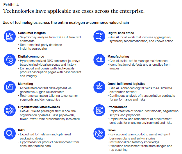 향후 5~10년 동안 차세대 전자상거래는 더욱 발전할 것이다. AI와 기술 인프라에 대한 투자는 계속해서 증가할 것으로 보이며, 이를 통해 기업들은 보다 개인화된 서비스와 효율적인 운영 모델을 구축할 수 있을 것이다. "Exhibit 4"에서는 AI 기술이 소비자 통찰력, 물류, 마케팅 등 다양한 영역에서 어떻게 적용되고 있는지를 보여주고 있다. 이를 통해 기업들은 복잡한 고객 요구를 충족시키는 맞춤형 서비스를 제공할 수 있을 것이다.