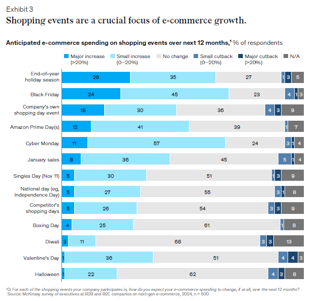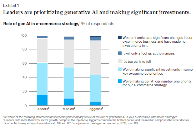 차세대 전자상거래는 기술 중심의 혁신이 진행되고 있는 중요한 시점이다. 특히 AI와 디지털 채널의 통합은 기업들이 고객의 구매 여정을 더 정확히 이해하고, 개인화된 서비스를 제공하는 데 기여하고 있다. McKinsey의 보고서에 따르면, 차세대 전자상거래의 리더 기업은 기술과 AI에 막대한 투자를 진행 중이다. 보고서의 "Exhibit 1"은 리더 기업들이 AI와 기술에 대한 투자를 우선적으로 진행하고 있음을 보여주며, 이들 중 20%는 AI를 전자상거래 전략의 최우선 순위로 삼고 있다.