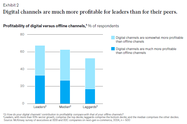 차세대 전자상거래는 여러 가지 장점을 가지고 있다. AI를 활용한 맞춤형 고객 경험 제공과 디지털 채널 확장을 통해 기업은 매출 증가와 브랜드 충성도를 높일 수 있다. 보고서의 "Exhibit 2"에서는 리더 기업들의 디지털 채널이 오프라인 채널에 비해 더 높은 수익성을 창출하는 모습을 확인할 수 있다. 특히, 30% 이상의 리더 기업들이 디지털 채널을 통해 "훨씬 더 높은" 수익성을 달성하고 있다고 답변했다.