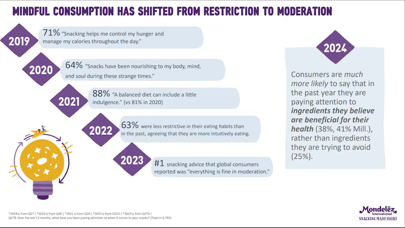 현대 소비자들은 건강과 즐거움 사이에서 균형을 찾고 있다. 76%의 소비자가 성분이나 칼로리를 걱정하지 않고 간식을 즐기고 싶어하는 반면, 74%는 양질의 영양소가 함유된 간식을 우선시한다. 이러한 이중적 욕구는 '허용된 사치'라는 개념의 부상을 가져왔다.