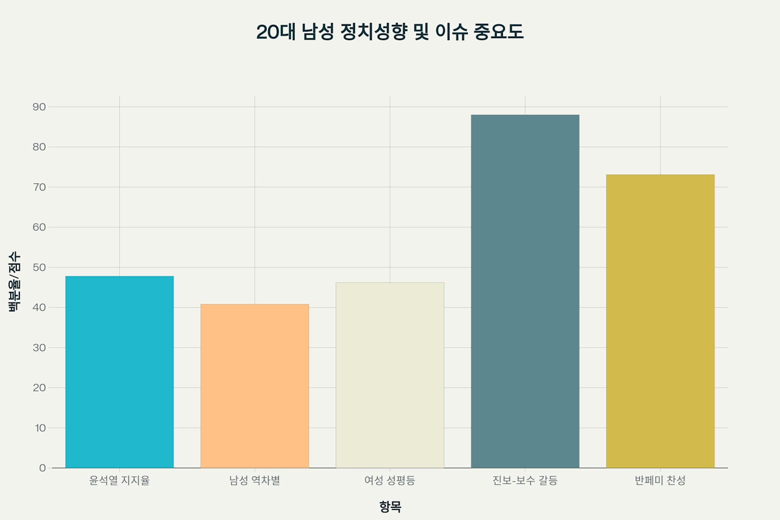 "남성 역차별 해소"를 중시한다고 답한 20대 남성이 40.8%에 달하는 반면, 20대 여성의 46.2%는 "성평등"을 중시한다고 답했다. 이러한 인식 차이는 자연발생적인 것이 아니라 왜곡된 정보와 편향된 보도에 의해 조장된 것이다.