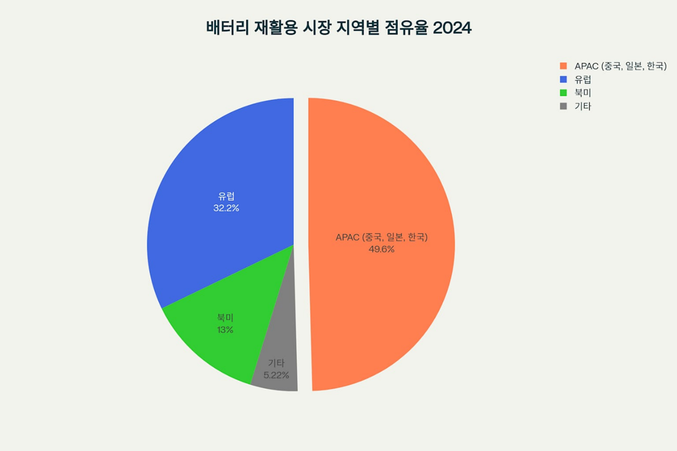 현실은 냉정하다. 중국이 배터리 재활용 시장을 압도적으로 장악하고 있으며, 2025년 기준 전처리 부문에서 78%, 정제 부문에서는 89%의 시장 점유율을 기록할 전망이다. 아시아태평양 지역 전체로는 57%의 시장 점유율을 보이며, 유럽이 37%, 북미가 15%를 차지하고 있다.