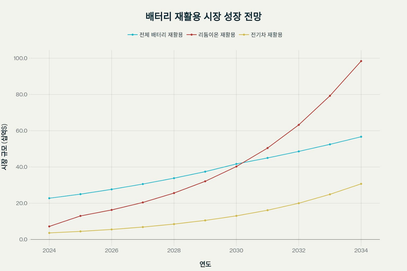 배터리 재활용 시장은 그야말로 로켓처럼 치솟고 있다. 2024년 227억 달러 규모에서 시작하여 2034년에는 566억 달러로 성장할 전망이며, 리튬이온 배터리 재활용 분야는 더욱 극적인 성장세를 보여 2024년 72억 달러에서 2034년 984억 달러로 무려 13배 이상 폭증할 것으로 예측된다.