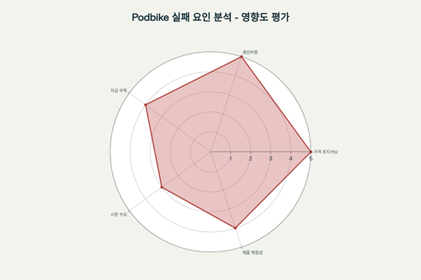 Podbike의 5가지 주요 실패 요인과 각각의 영향도를 레이더 차트로 분석