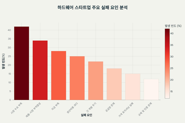 하드웨어 스타트업의 주요 실패 요인과 발생 빈도를 분석한 차트