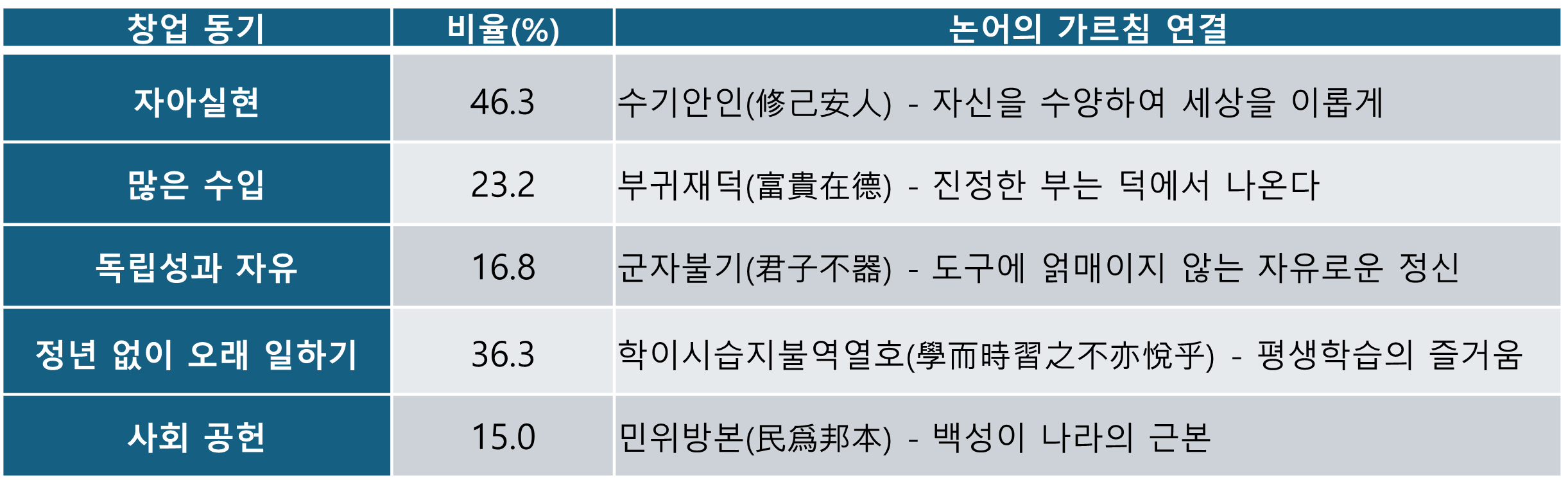 현대 청년들의 창업 동기를 살펴보면, 자아실현이 46.3%로 가장 높은 비중을 차지한다. 이는 논어의 수기안인(修己安人) 정신과 완벽하게 일치한다.