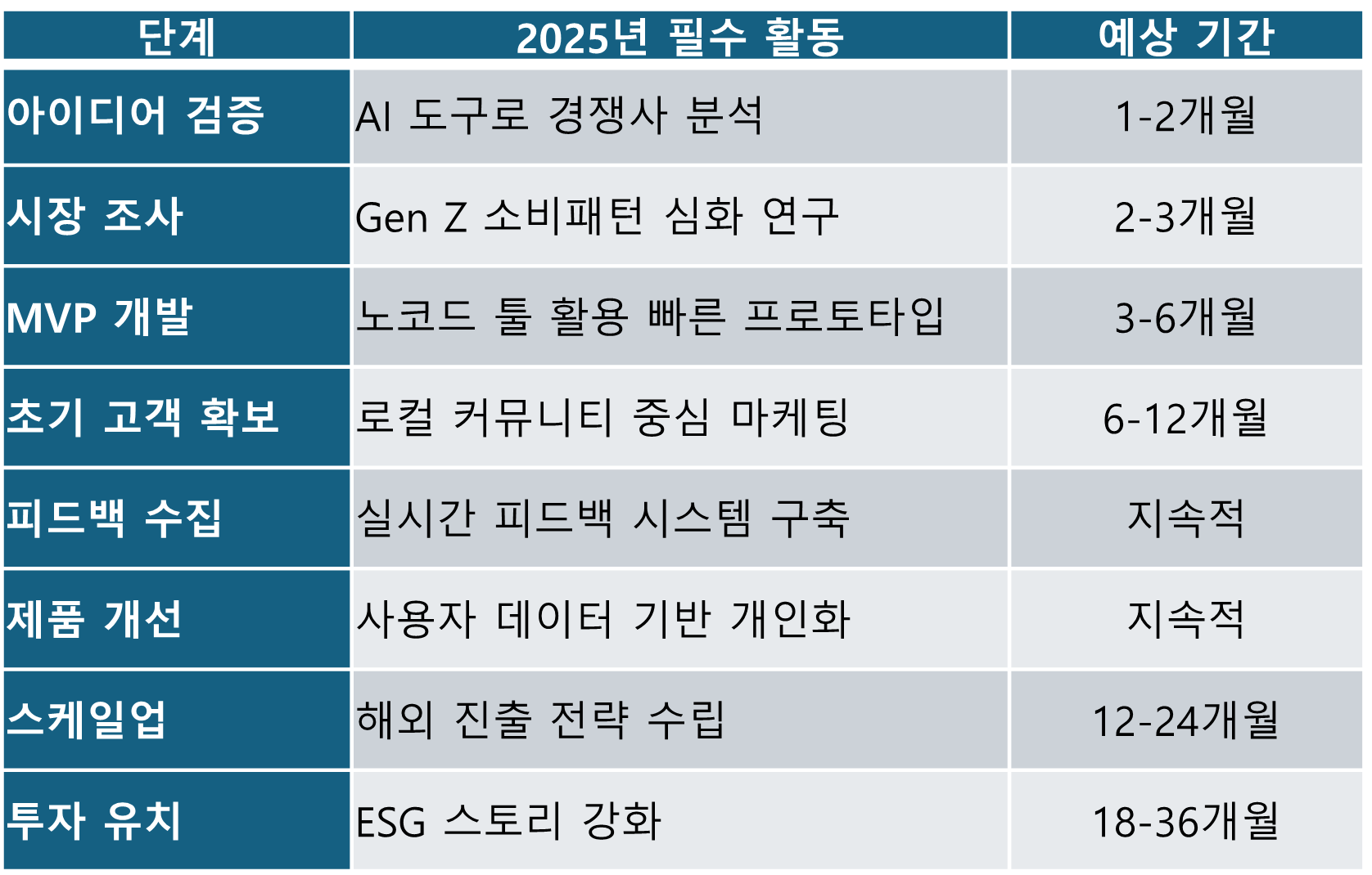 실행 단계별로는 아이디어 검증부터 투자 유치까지 체계적인 접근이 필요하다. 특히 2025년에는 AI 도구를 활용한 경쟁사 분석, Gen Z 소비패턴 심화 연구, 로컬 커뮤니티 중심 마케팅, 실시간 피드백 시스템 구축이 각 단계별 핵심 활동이다.