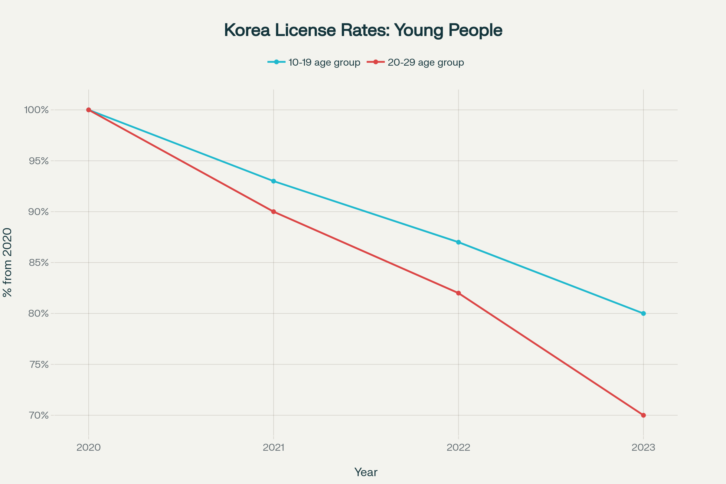 가장 주목할 점은 젊은 세대의 자동차에 대한 인식 변화다. 1980년대 미국 18세 청년의 80-90%가 운전면허를 취득했던 것과 달리, 현재는 50%에 불과하다. 한국 역시 비슷한 변화를 겪고 있다. 2023년 기준 10대와 20대의 운전면허 취득률이 2020년 대비 각각 20%, 30% 감소했다.