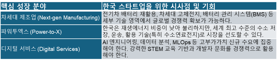 마지막으로, 매킨지 보고서는 2040년까지 연간 5,900억 달러에서 최대 1조 2,000억 달러의 추가 매출을 창출할 수 있는 구체적인 기회의 지도를 제시한다. 매킨지는 차세대 제조업, 파워투엑스, 디지털 서비스, 데이터센터, 농식품, 석유 및 가스, 핵심 광물 등 7개 분야를 핵심 성장 동력으로 지목했다. 이 중 특히 한국 스타트업의 강점과 직결되는 3가지 영역의 기회는 다음과 같다.