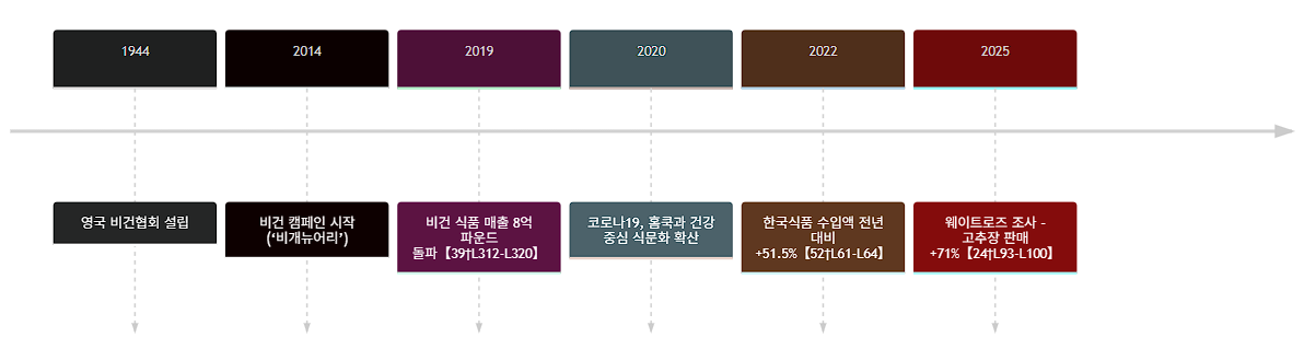 - 건강 중심 채식 붐: 영국 내 비건·채식주의 인구는 전체의 약 12%로 추산된다. 면역력·장 건강·다이어트 등 개인 건강 수요가 채식 열풍을 주도하며, 2019년 비건 식품 매출은 2017년 대비 40% 증가해 8억 파운드를 기록했다. 대형 유통체인도 비건·식물 기반 메뉴를 빠르게 늘려가고 있다.