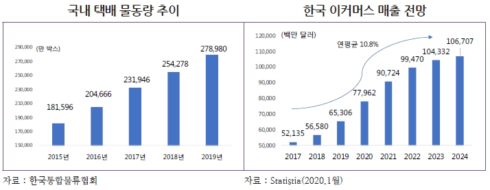 - 국내 택배물량은 2015년 이후 매년 10% 내외로 증가. 2019년 국내 O2O 서비스 기업 매출액은 약 2.9조원으로 전년 대비30.4% 증가9)