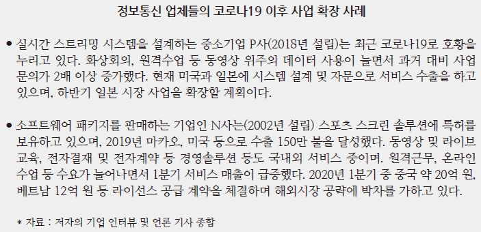 ● 원격 솔루션, 온라인스트리밍 서비스(OTT) 등 정보통신 서비스를 제공하는 기업들은 코로나19로 인해 업황 호조세이며 향후 사업 확장 계획을 밝힘