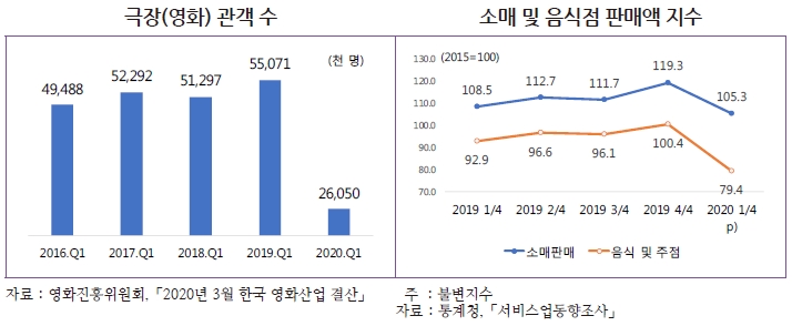 ◎ (문화/소매) 코로나19 감염 위험이 높은 공공장소 기피 현상 및 외출 자제로 문화 서비스, 소매업, 음식업 등 매출이 크게 부진