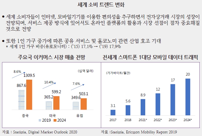 ● 기존 오프라인 서비스 사업을 온라인과 결합하는 통합적인 접근 방식이 요구. 또한 온라인 플랫폼 구축, 스마트 배송망 구축 등 다양한 비대면 유통 채널 확보에 노력