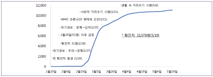 ● 2월 19일 이후 폭발적으로 증가하던 코로나19 확진자 수는 정점을 지나 4월부터 증가세가