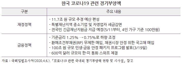 ● 우리 정부는 코로나19 관련 긴급재난지원금 지원, 세금감면, 중소·중견기업 금융지원 확대 등 경기회복을 위한 지원을 강화. 하반기부터 소비 심리가 개선되며 서비스업 경기도 차차 회복될 것으로 기대