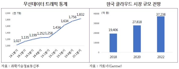 - 온라인 개학, 화상회의 등 여러 명이 동시에 접속하는 서버 및 데이터를 효율적으로 관리하기 위해 저장장치를 외부에 두고 관리하는 클라우드 수요가 많아질 것임. 2018~2022년 중 국내 클라우드 시장은 연평균 17.7% 확대될 전망