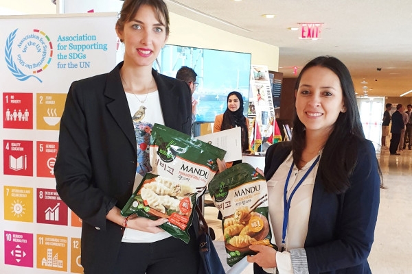 지난해 7월 뉴욕 유엔 본부에서 UN지원SDGs협회가 발표한 ‘전 세계 가장 지속가능한 기업’과 ‘전 세계 가장 지속가능한 브랜드’ 최우수 그룹에 각각 선정된 것과 관련 유엔본부에 차린 CJ제일제당 비비고 홍보 부스. 사진=CJ제일제당 제공