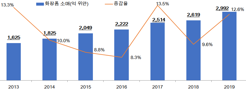 중국 화장품시장은 최근 몇 년간 지속적인 성장세를 이어왔고, 2019년 소매규모가 3000억 위안에 육박할 정도로 몸집을 불렸다.