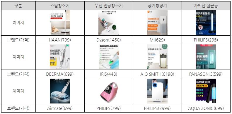 톈마오(天猫)가 발표한 자료에 따르면 해외 유명 브랜드에 대한 구매 선호도가 높으며, 공기청정기의 경우 가성비가 뛰어난 샤오미(小米)가 상위 검색순위를 차지하고 있었으며 종합 가전제품을 판매하는 필립스(PHILIPS)는 대다수 제품군에서 인기를 얻고 있는 것으로 나타났다.