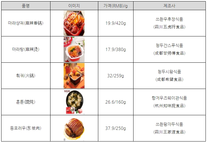 최근 반제품 가정간편식 비중이 높아지고 있으며, 온라인에서 활동하는 왕홍(网红)들은 가정간편식을 집에서 직접 조리해서 먹는 방법을 중국 동영상 스트리밍 플랫폼 도우인(抖音) 등을 통해 소개해 소비자들의 좋은 평가를 받고 있다. 특히 간식으로 자주 먹는 마라샹궈(麻辣香锅), 마라탕(麻辣烫), 훠궈(火锅) 등은 자체 발열용기가 내장된 식품으로 집에서 별도의 조리기구 없이 편리하게 먹을 수 있어 각광받고 있다.