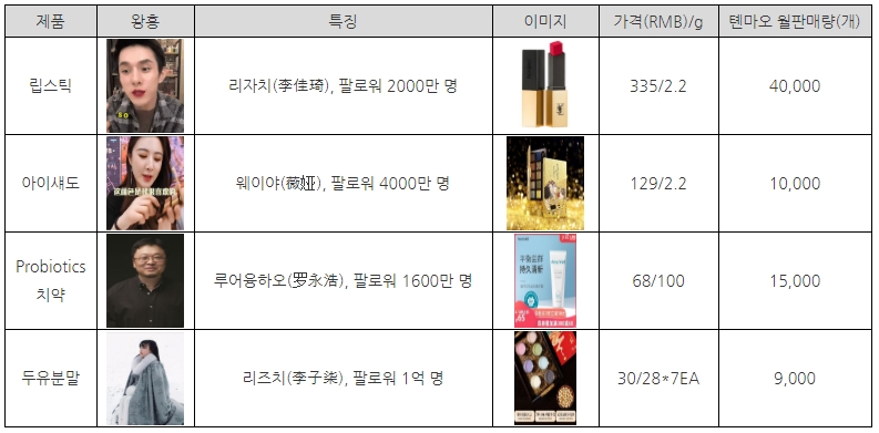 왕홍 마케팅을 통해 판매하는 주요 제품