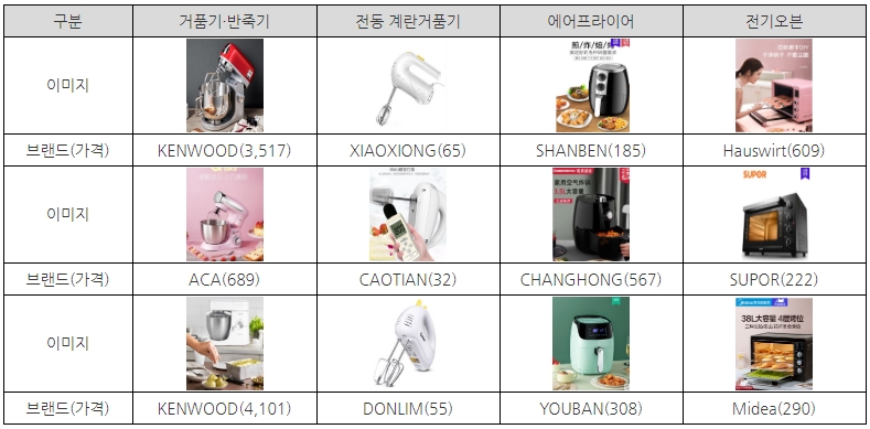 데이터 분석기관인 ECdataway는 올해 2월 주방가전 및 조리기기 판매가 증가했으며 그중 거품기·반죽기, 전동 계란거품기, 에어프라이어, 전기오븐 판매가 급증했다고 발표했다. 실제 전년 동기 대비 톈마오(天猫) 판매량을 살펴보면 거품기·반죽기 847%, 전동 계란거품기 642%, 에어프라이어 325%, 전기오븐은 209%가 증가했다.