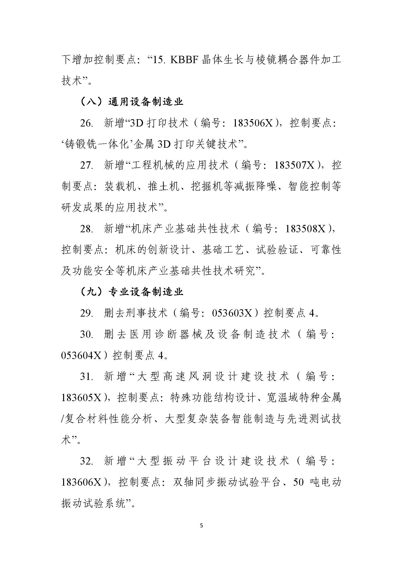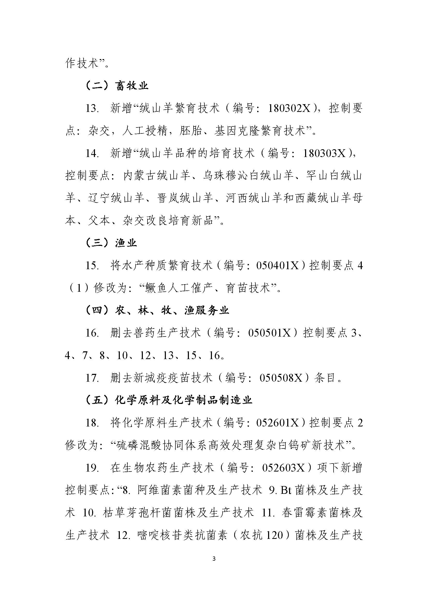 먼저 미생물 비료 기술, 카페인 생산 기술, 비타민B2 생산 공예, 비타민 발효 기술 등 4가지 수출금지 기술항목을 삭제했다. 또한 뉴캐슬병 백신기술(新城疫疫苗技术), 천연약물 생산기술, 기능성 고분자소재 제조와 가공기술, 화학 합성 및 반합성 약물 생산기술, 정보보안 방화벽 소프트웨어 기술 등 5개의 수출제한 기술항목을 삭제했다.