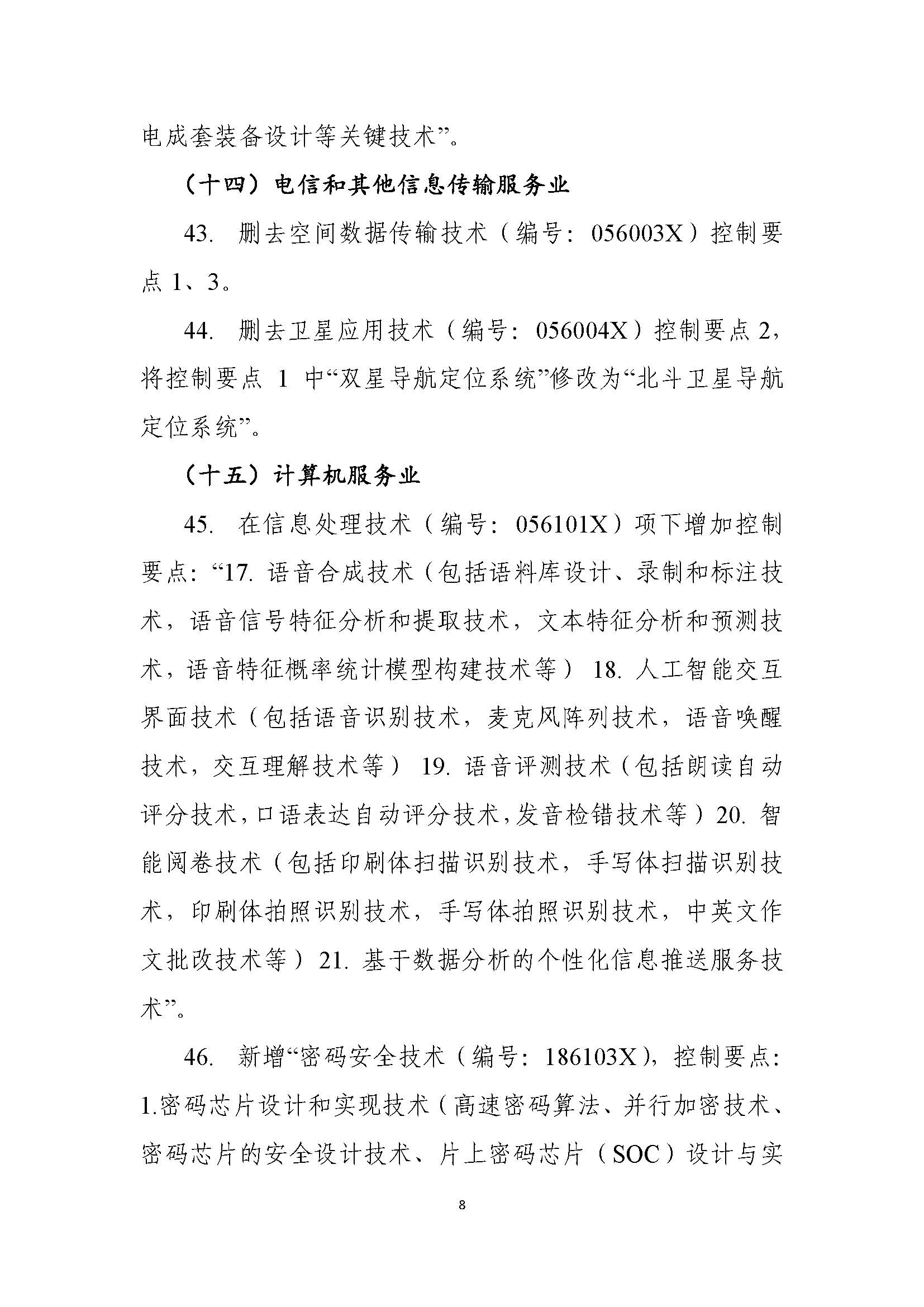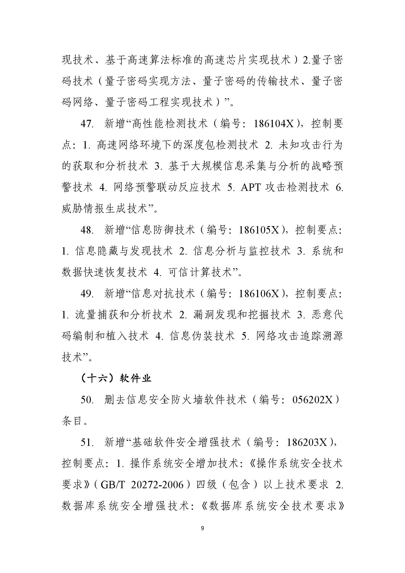 9. 위성 응용기술(번호:056003J) 규제 요점을 “북두위성 항법시스템 정보 전송 암호화 기술”로 수정 |