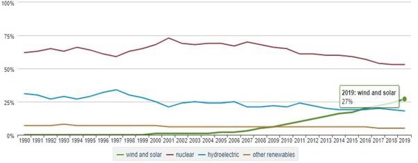 미국 에너지부 산하 에너지관리청(U.S Energy Information Administration, EIA)이 9월 30일 발표한 보고서에 따르면 재생에너지 중 가장 빠른 성장세를 보이는 분야는 태양과 풍력(wind and solar)으로 2009년 6%에서 2019년 27%로 21%포인트 증가했다. 여전히 재생에너지 중 원자력(nuclear)이 가장 큰 비중을 차지하고 있으나 태양열과 풍력을 이용한 재생에너지 증가로 원자력도 서서히 감소하는 중이며 전통적으로 재생에너지 중 큰 비중을 차지했던 수력발전(hydroelectric)도 다른 재생에너지들의 등장으로 1997년 34%에서 2019년 18%로 감소했다. 바이오매스 등 기타 재생에너지(other renewable)는 아직 미미한 수준에 그쳤다.