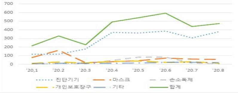 방호복, 라텍스 글러브, 안면보호구 등과 같은 의료용 개인보호장구의 2020년 상반기 동안 세계 수입수요가 계속 증가했다. 체온계, 인공호흡기 등을 포함한 이들 제품의 세계 수입시장 규모는 265억 달러로 전년 동기 대비 50.7% 증가했다.