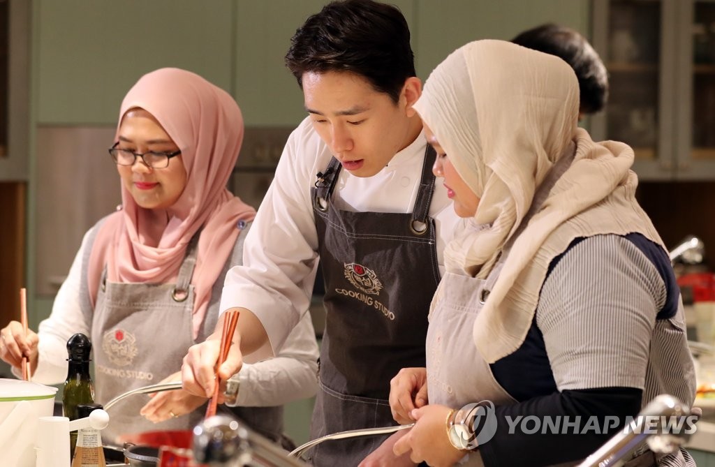▲'할랄식 K-푸드' 쿠킹 클래스 이슬람교도 외국인 관광객들이 CJ제일제당에서 열린 쿠킹클래스에 참가해 최광호 셰프와 함께 할랄 인증 재료를 활용해 K-푸드를 만들고 있다.