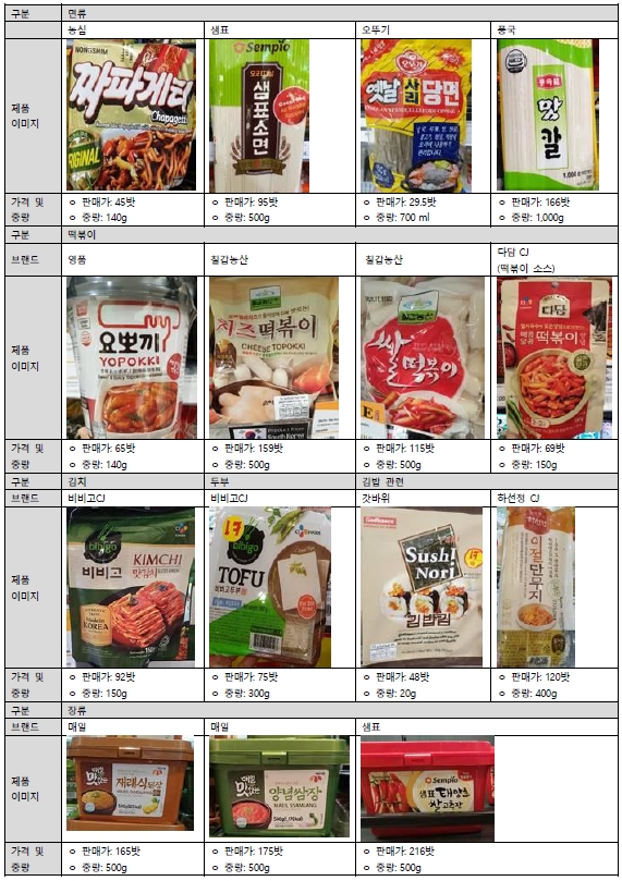 KOTRA 방콕 무역관의 방콕 시내 슈퍼마켓(Gourmet Market)의 식품코너 조사 결과 한국 드라마와 관련도가 높은 상품들로 라면류, 떡볶이, 김밥용김, 단무지, 소면, 당면, 두부, 소스류, 김치, 만두 등이 판매되고 있는 것으로 확인되었다.