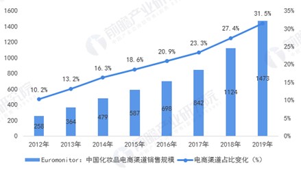 중국 모바일 인터넷의 발전과 소비 습관 변화, 그리고 다양한 국내외 뷰티 브랜드가 잇따라 온라인 전자상거래 플랫폼에 입점하면서 뷰티 업계의 온라인 진입이 많아지고 있다. 2010년 이전, 중국 화장품시장에서 전자상거래 채널의 시장점유율은 1% 미만이었으나, 2009년부터는 점유율이 급격히 상승하기 시작했다. 2016년 이후 온라인 화장품시장이 급속한 성장세를 보였고, 2018년 27%의 점유율로 KA 채널을 제치고 1위 유통채널로 올라섰다. 이후 2019년 중국 화장품 전자상거래판매 규모는 약 1473억 원에 달했으며 전체 시장의 약 31.5%를 차지했다.