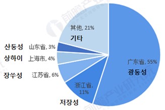 화장품 기업의 지역별 분포를 보면, 2020년 5월 20일 기준 광둥성에 화장품 생산기업 수가 가장 많으며, 전체의 약 55%를 차지한다. 그 다음은 저장성이 11%를 차지한다. 기업수 상위 5지역이 중국 전체 화장품 생산기업의 79%를 차지한다.