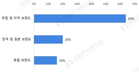 2019년 1분기 중국 화장품 브랜드 원산지에 따른 소비자 관심도