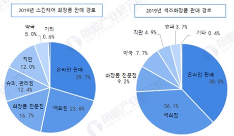 제품분류로 보면, 전자상거래 채널은 스킨케어 제품 판매의 30%를 차지하고 색조화장품 판매의 38%를 차지한다.