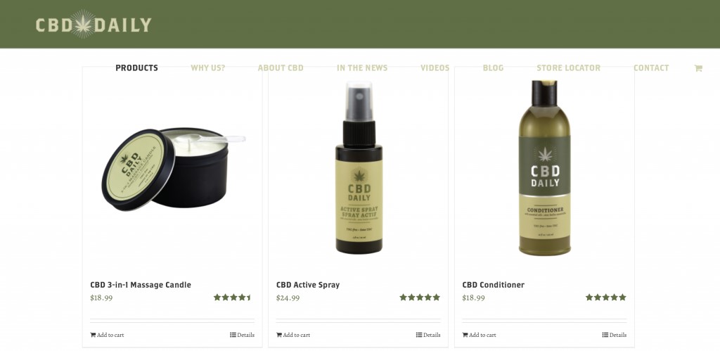 인디 화장품 브랜드 CBD DAILY에서는 CBD를 적용한 다양한 제품을 출시하고 있다. 글로벌 트렌드로 자리잡고 있는 ‘비건 화장품’을 내세우면서도 CBD라는 특이 성분을 적용하여 차별성을 가져가고 있다. 기본적인 오일, 오일 밤, 마사지 캔들류에서부터 시작해 얼굴 피부에 적용 가능한 로션, 크림에서부터 샴푸, 컨디셔너에 이르기까지 다양한 부위에 사용 가능한 제품을 출시하고 있다.