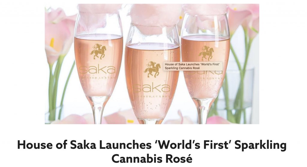 대규모 와인 생산지로 유명한 샌프란시스코 나파 밸리의 한 와이너리에서 실험적인 제품을 내놓을 에정이라고 한다. 럭셔리 와이너리를 지행하는 House of Saka에서는 CBD를 함유한 올해 신규 와인 제품군 출시를 발표했다. 정확히 말하자면 논알콜 스파클링 와인에 CBD와 THC를 배합한 제품이다. 법적으로 CBD, THC류의 성분은 알콜과 함께 배합되는 것이 금지되어 있기 때문에 논알콜 와인에 적용하여 제품이 개발되었다. 술과 대마의 조합, 글자로 봐서는 굉장히 위험한 조합같이 여겨진다. 와인이라는 고급 이미지를 가진 제품군에 CBD 성분을 적용함으로서, CBD 성분의 가치를 높인 한편으로 와인 업계의 시각에서는 젊은 세대를 타겟으로 접근성을 낮추려는 사례로 볼 수 있겠다.