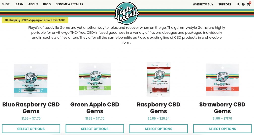 유명 자전거 사이클 선수 플로이드 랜디스가 도핑과 관련된 여러 스캔들을 극복한 후 설립한 기업 Floyd’s of Leadville은 CBD 특화 제품을 판매하고 있다. 운동 후 통증을 경감하고 회복을 돕는 CBD 오일류 제품군으로 시작해서 최근에는 보다 간편한 방식으로 CBD를 활용할 수 있는 간식, 간편식 제품군을 선보이고 있다. 가장 최근 출시된 제품으로는 간편하게 섭취할 수 있는 CBD 젤리가 있다. 라즈베리, 애플, 딸기, 블루 라즈베리 맛으로 구분된 상품들은 각각 함유하고 있는 CBD 양이 다르다. 10mg, 50mg으로 구분되어 있어 일반 비타민제처럼 섭취를 원하는 양을 선택하여 구매하면 된다.