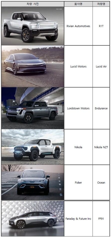 벤처기업도 있다. 그중 아직 한 대도 생산하지 못했고 생산, 가격, 안전성 등 극복해야 할 사항도 많지만 제2의 테슬라를 추구하는 기업이 있다. Rivian Automotives(픽업트럭), Lucid Motors 승용차), Lordstown Motors(픽업트럭), Nikola(트럭), Fisker(SUV), Faraday & Future Inc(승용차) 등이다. 이들 회사들은 기술개발에 성공하면 대형 자동차 회사에 M&A될 가능성이 있다.