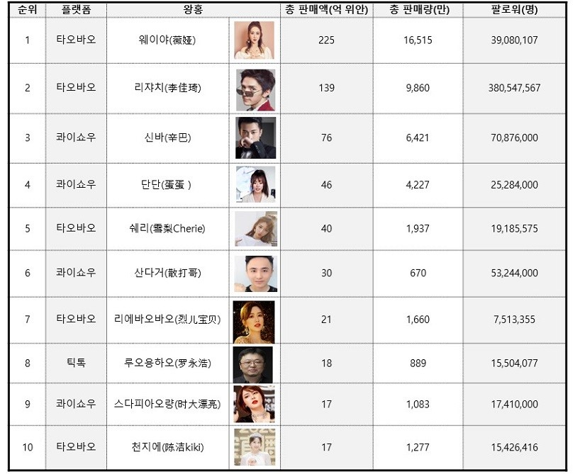 2020년 6~12월 GMV(판매액) 기준 상위 10위권 왕홍 정보