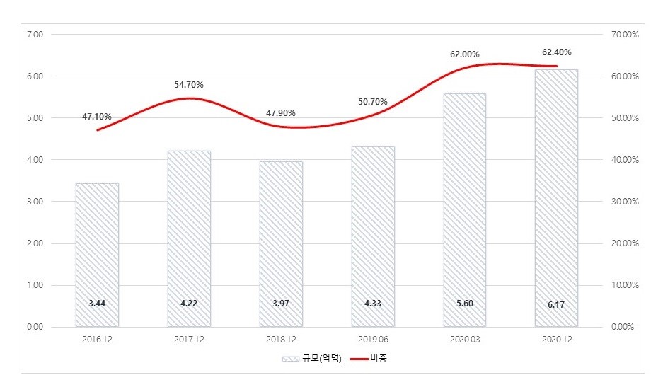 2016~2020년 온라인 라이브 방송 이용규모 및 비중