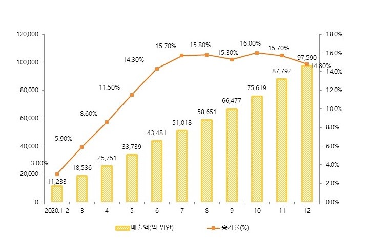 2020년 중국 실물 상품 온라인 판매액 월별 추이