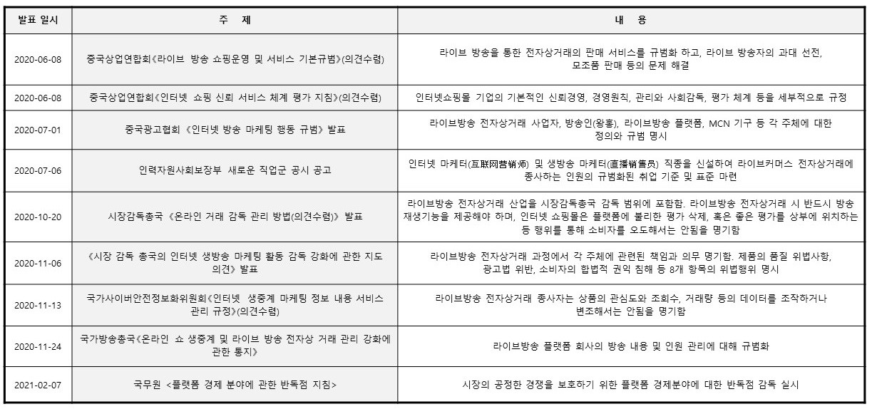 증가하는 라이브커머스 시장 규모, 이용량에 따라 중국 각 정부 부처도 관련 규정을 제정하고 모니터링을 강화하고 있는 추세다. 2020년 7월 중국 인력자원사회부는 '인터넷 마케터(互联网营销师)', '생방송 마케터(直播销售员)' 직종을 신설했으며, 10월 중국 시장감독총국은 《사이버 거래 감독 관리 방법》을, 11월 국가인터넷정보판공실은 《온라인 라이브커머스 마케팅 콘텐츠 서비스 관리규정》을 잇달아 발표하며 중국 내 라이브커머스 산업 체계가 정비되고 있다.