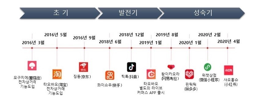 2016년 초기 타오바오, 징동 등 주요 플랫폼은 ‘생방송+콘텐츠+온라인판매’의 새로운 모델을 도입했다. 이후 2018년 발전 단계에 접어들며 콰이쇼우(快手), 도우인(抖音) 등 동영상 플랫폼이 기존 엔터테인먼트 숏클립 커뮤니티 기능에 타오바오, 티몰 쇼핑몰 등 제3자 판매플랫폼과 연동해 온라인 매출까지 일어나는 라이브커머스 판로를 열었다.