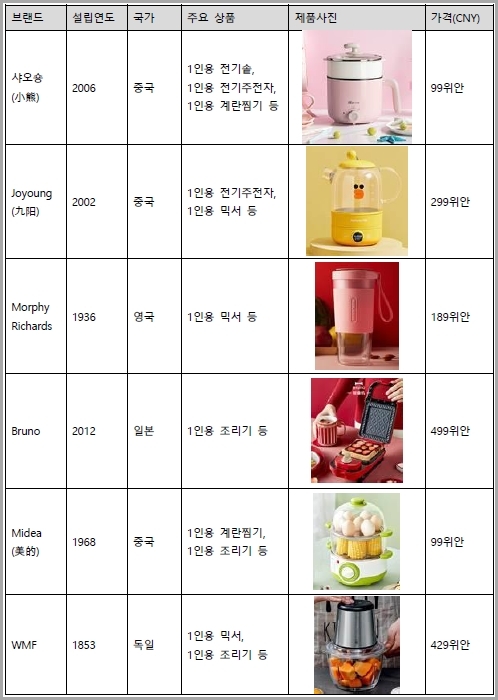 중국독신(1인) 경제가 새로운 소비 트렌드로 자리함에 따라, 샤오숑(小熊), 지우양(九阳 ), 메이더(美的) 등 주요 가전브랜드는 일찍부터 해당 소비군을 타깃으로 한 다양한 가전제품을 출시해 시장을 선점 했다. 일반적으로 소형가전은 1인 소비자가 주로 거주하는 소규모 주거 환경에 적합하며, 편의성을 강조하여 다양한 기능을 포함하고 있고, 젊은 층이 선호하는 세련된 디자인, 색상을 겸비한 것이 주요 특징이다.