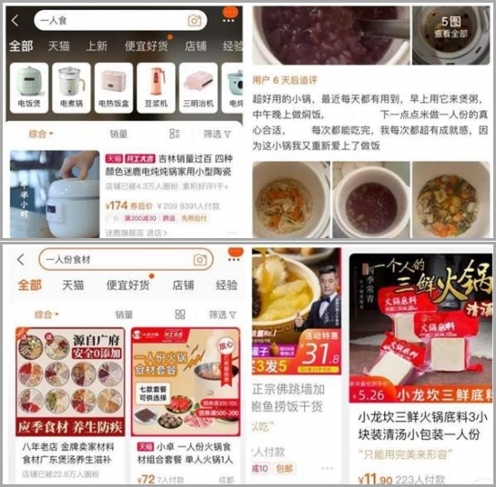 전자상거래 플랫폼 티몰이 발표한 《2019-2020 국민의 맛(2019-2020国民味道)》에 따르면, 2019년 티몰의 소용량 술, 500g의 포장 쌀 등 1인 소비층을 타깃으로 한 상품의 판매량은 전년 동기 대비 30% 증가했다. 특히 618 쇼핑 페스티벌 기간 중 1인용 샤브샤브 제품(自热小火锅) 판매량은 전년 동기 대비 80% 증가했고, 즉석밥은 전년 동기 대비 800%까지 증가해 하나의 소비 트렌드로 자리 잡은 양상을 보였다. 메이퇀 배달업체(美团外卖), 중국호텔협회(中国饭店协会) 및 iResearch가 공동 발표한 《2020 배달업계보고(2020外卖行业报告)》에 따르면 2019년 중국 요식업 시장규모는 총 4조6000억 위안 규모로 그중 배달업 규모는 6535억7000만 위안을 기록했으며, 또 1인 식사의 비율이 요식업, 배달업 각 65.4%, 73.7%로 젊은 소비층일수록 '1인식(一人食)' 식사를 선호하는 특징을 보였다.